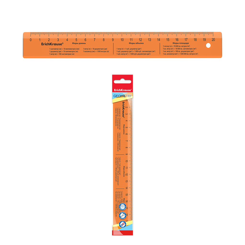 Линейка 20 см Erich Krause "Neon" оранж. с единицами измерения в п/э с европодвесом