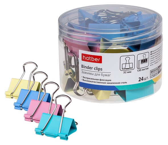 | 909432 | Зажим д/бумаг 32 мм Hatber ассорти в пл. тубе | BC_059117 | 0.005 | 24 | |