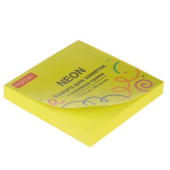 Бумага д/записей с липким слоем Hatber 75х75 100 л. "Neon" желт.