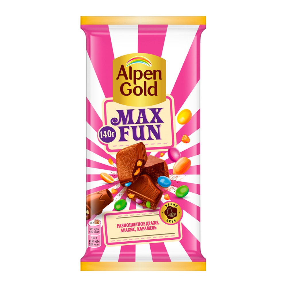 Шоколад Alpen Gold "Max Fun" плитка, молочный с арахисом, драже и взрывной карамелью 140 г