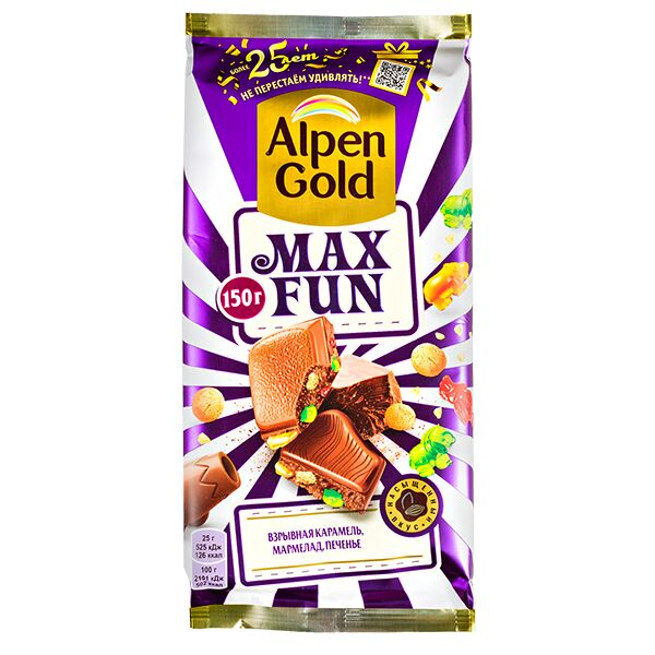 Шоколад Alpen Gold "Max Fun" плитка, молочный взрывная карамель, мармелад, печенье 140 г