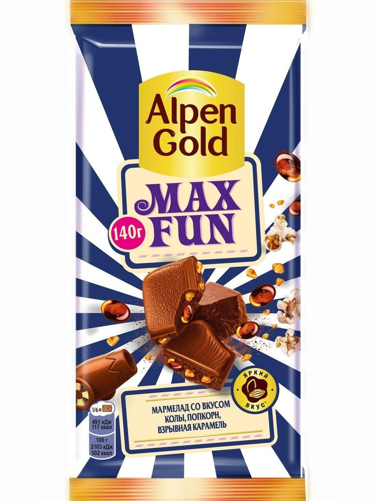 Шоколад Alpen Gold "Max Fun" плитка, молочный мармелад, кола, попкорн, взрывная карамель 140 г