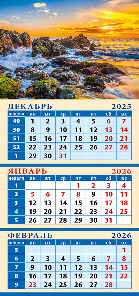 | 927448 | Календарь квартальный 2026 г. на магните в п/э пакете "Морской закат" 110х245 мм (День за днем) | 34620 | 0.028 | 30 |